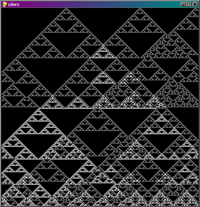 A one dimensional cellular automata. My favourite rule set is this one that creates Sierpinski gaskets, but there are a few other interesting rules. Program makes use of topics covered more directly in other programs. Of particular note, it draws on the screen by directly changing single pixels. |