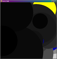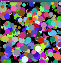 Bounces a number of balls of different size and color around the screen. Deals with multiple persistent objects in a more interesting program than earlier structured data programs. Deals a little more interestingly with motion and boundaries. |