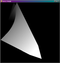 Based on bouncy.py, this program draws the polygon filled. The fading effect is accomplished by drawing the polygon offscreen on a transparent black background then laying that on top of the existing drawing. Each frame lays a little more black over old pixels and fades them towards black. |