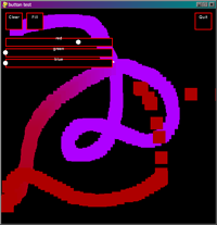 The program isn't much to talk of. It's just anothe little paint program. What is important about it is that it is the testbed for control widgets, two kinds of button and a slider, written as Python classes descending from Pygame's Rect class. Button_Momentary - a command button. "When this button is pressed, do something." Button_Toggle - a button that can be on or off. "When this button is pressed it changes state." Button_Slider - a control with a movable thumb to set a value between a given min and max. Controls - an invisible container for all your controls. Add buttons and sliders to this and it manages them. Sort of. In order to make stuff happen you need to add some code to your Pygame event handler and the mechanism for retrieving slider values goes totally around this. The important parts are globals for the sliders at the top "sld_r" etc. All the class definitions. Controls are actually created in init(). Control activity is managed in eventhandler() as part of mouse behaviour. Slider values are used in run() on the pygame.draw.rect() line. Note that in the code here, I don't consume mouse events if a control reacts to them, feel free to in your own code. Let me check to see if there is a way to know... no, I think control handling only returns an interesting value if an important action happened. I need to package the buttons into their own self contained library. I need to write better documentation for how to use them. I need to change some details of how they are used. |