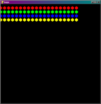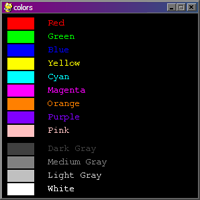 Sole purpose of this is to show how different colors are made using (red, green, blue) tuples. For the computer graphics beginner colors are not the same as you learned in kindergarten: "Yellow is WHAT?!" But you can also grab the text drawing code out of it. |