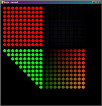 One loop gives you a row of things. If each thing is a loop of things you get a grid. This is very common in computer programming. Loop through all the customers and for each customer loop through all their purchases. Loop through all the rows of pixels and for each row loop through all the pixels. One loop inside another and we call them "nested." The red here is just simple nested loops doing the same thing at each step. The green one changes the inner loop based on where the outer loop is. As it moves across, it moves down further. The blue one is four loops nested. The outer two are pretty much the same as the red set - a simple grid of dots. But instead of a dot, there are the two innermost nested loops that create their own simple 3x3 grid at that location on the larger grid. And finally the fall colors are pretty much the same as the red, but the color of the dot varies based on the loop control variables. You can start to see the logic and power behind nesting loops. |