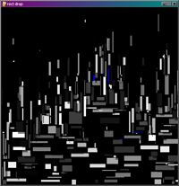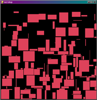 Based on rectdrop.py. Adds drop shadows for a cool 3d effect. Adds rectangle size based on mouse location. Adds nicer colors. Adds random deletion of rectangles so the composition changes even after the screen fills up. |