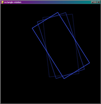 Draws a rotating rectangle that follows the mouse. Uses some fancy but standard math and a handful of special case shortcuts to make the rotation. Program does not actually draw trails. I just did that for the picture so you could see that "it rotates" better. |