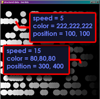 if (ball["loc"][1] + ball["speed"]) < height: ball["loc"][1] = ball["loc"][1] + ball["speed"] number_moved = number_moved + 1 pygame.draw.circle(screen,ball["color"],ball["loc"],size,0)Oh, if the ball's location plus its speed is less than height... it's all so clear now. Now we're getting fancy. This is actually the first solution that I would consider to really be "structured data". But maybe that's just nit picking. Python supports object oriented programming techniques and in order to do that it supports classes. But it is also a run-time interpretted language without bound data types (hunh? whatever.) it lets you get away with creating an empty class and just sticking whatever you want to in it and then asking for it later. This would get you in trouble with a lot of other languages, but Python's cool with it and... What I like about it for the beginner is that the data stays together in a nice bundle, that data is easy to get to, data access if very legible, it starts to introduce the important idea of classes BUT it doesn't burden the beginner with full class implementation issues. You can just look at the prototype here for how to set up the data and duplicate it without too much "wait, what's going on here" confusion. Again, all the balls go in a list. The fourth ball is still balls[3]. The data that belongs to ball[3] is referenced with a dot and its name. Where is ball[3]? ball[3].loc. What is its color? ball[3].color. if (ball.loc[1] + ball.speed) < height: ball.loc[1] = ball.loc[1] + ball.speed number_moved = number_moved + 1 pygame.draw.circle(screen,ball.color,ball.loc,size,0)So, there's a few ways to go about creating your own "things" to store and manipulate. If you have the time look at them all. If you are in a hurry and writing something relatively simple just grab sd_classempty.py and work with that. If you are writing a larger more complex (more "real") program then maybe you should take the time to look at sd_classbetter.py and do the extra research for classes and object oriented programming. If all this programming stuff is making your head hurt and you aren't really sure what you have been doing up to this point, maybe you want to stick with sd_manylists.py. Based on sd_classempty.py, this adds just a little bit of rigor by defining a constructor for the class and setting the data fields properly. This takes five lines of code in the middle of the real part of the program and turns it into one tidy call to __init()__ like this... balls.append(Ball([i,size],[c,c,c],r.randint(1,maxspeed))) and lets __init()__ sort out the job of putting the numbers into the right data fields. Also by packaging the ball initialization code into one place it makes it a bit more robust. The fields are accessed the same way as before: ball[3].color. This is based on sd_class.py, but it starts to use the class in a more proper object oriented manner. Classes don't just define data fields, they also define the behaviour (methods) that the data can do. So rather than the main program trying to move balls according to some rule set, it just asks the ball "hey, could you move yourself please?" The code looks like this...